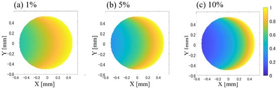 Table 2 presents the absorption coefficients and attenuation ratios of the light energy before and after transmission through a 1 mm-thick glass cuvette for each VFP. The light energy was corrected based on the measurement results at VFP 0%. The absorption coefficients were calculated using the redLambert-Beer’s law. The light attenuation ratios across the cross-sectional area of the flow tube were calculated using these values. The results are shown in Figure 12. The computational grid was set to 100 × 100 with an interval of 0.01 mm, and a circle with a radius of 0.5 mm was used as the cross-section of the flow tube. Assuming that light was irradiated from the positive X direction, the distance between each coordinate and the wall surface in the positive X direction was taken as the light path, and the light attenuation ratio was calculated using Lambert-Beer’s law. Light is sufficiently irradiated near the wall surface in the positive X direction and attenuates as it progresses in the negative X direction. This was calculated based on the light absorption coefficient at each VFP. The light attenuation became more pronounced with an increase in VFP. The weighted flow velocity was calculated from the following equation, using this light attenuation ratio as the weight.