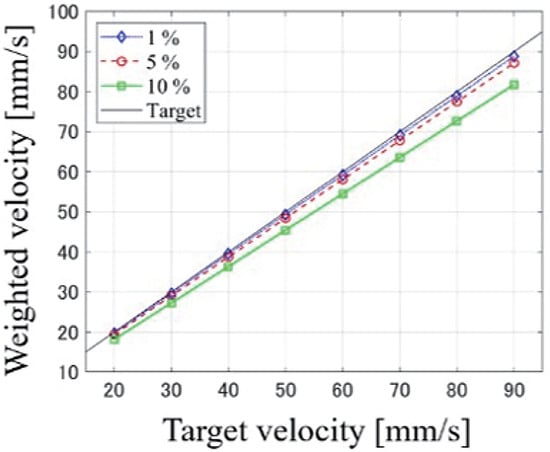 We calculated the weighted average flow velocity for each velocity range. The spatial distributions of the flow velocities were calculated for the cross-sectional area inside the tube. The results are shown in Figure 13. The redunderestimation rate was −3.2% at 5% VFP and −9.1% at 10% VFP, which is smaller than the redunderestimation rate of flow velocity measurements. Therefore, light penetration depth has a minor effect on the underestimation.