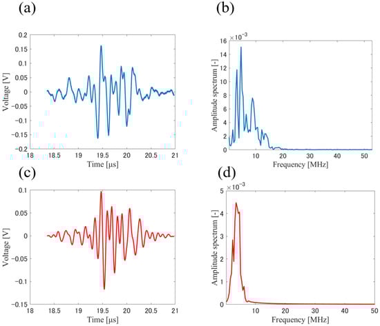 Typical time signals and their frequency spectra obtained in the experiment, (a) extracted time signal, (b) frequency spectrum of the time signal shown in (a), (c) bandpass filtered time signal shown in (a), (d) frequency spectrum of the bandpass filtered time signal shown in (c).