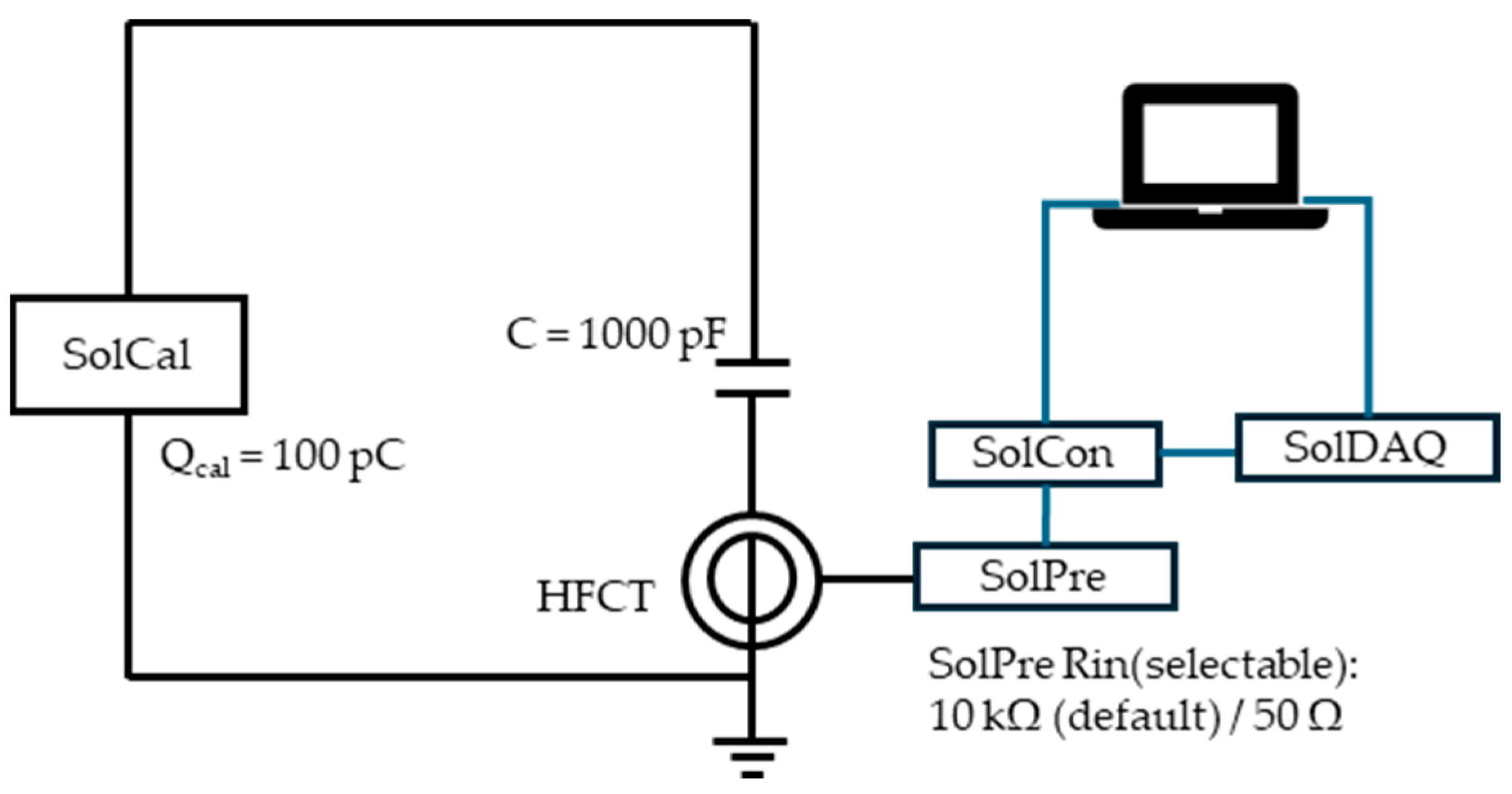 Figure 4. The standard IEC 60270-compliant calibrator is based on a step front generator having in series a capacitor. In this way, specific pulses are generated simulating PD discharges with a defined charge of 100 pC. For this test, the following were employed: