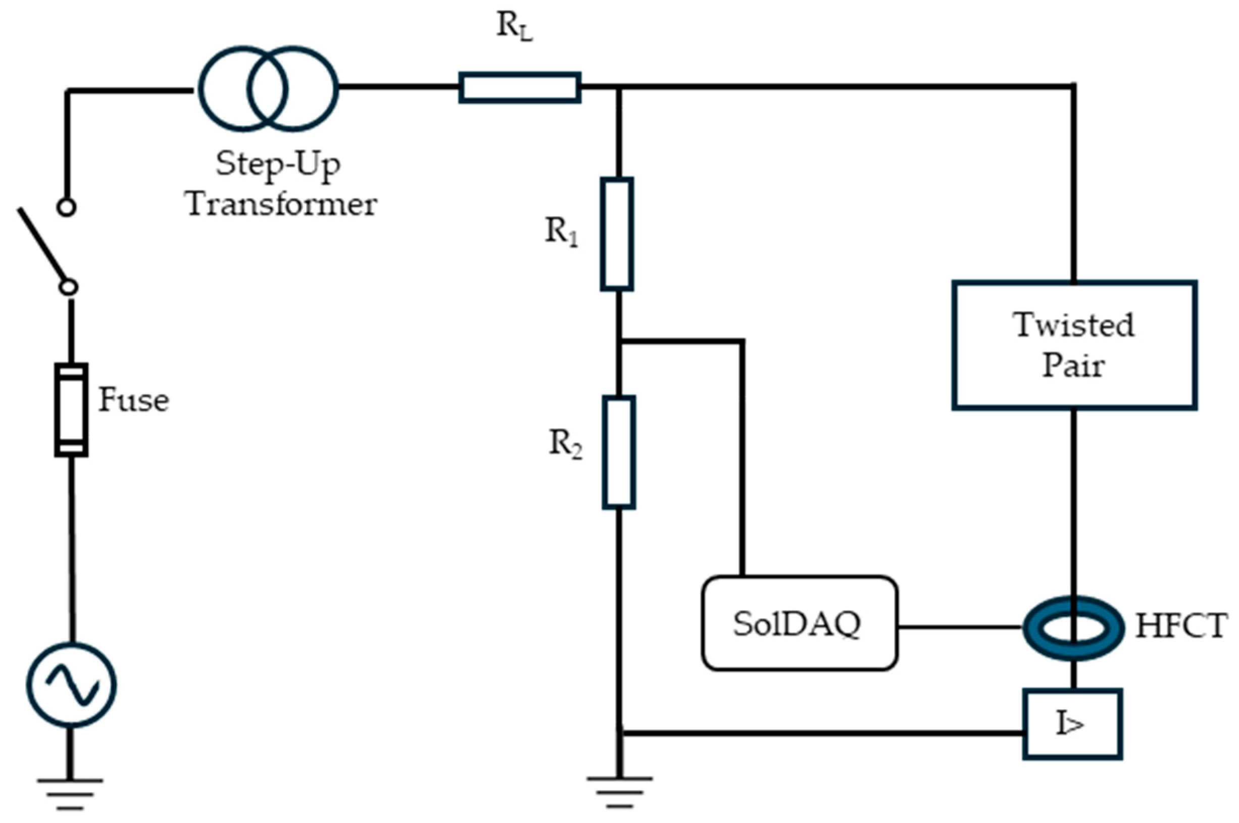 38], a twisted pair. Partial discharge (PD) signals were acquired under sinusoidal excitation at a frequency of 50 Hz. The test voltage was generated using an arbitrary waveform generator, amplified, and applied through a step-up transformer with a transformation ratio of 15:5000. An overcurrent protection device (I>) was implemented to interrupt the test and disconnect the supply in the event of a short circuit, while the short-circuit current was limited by a series limiting resistor