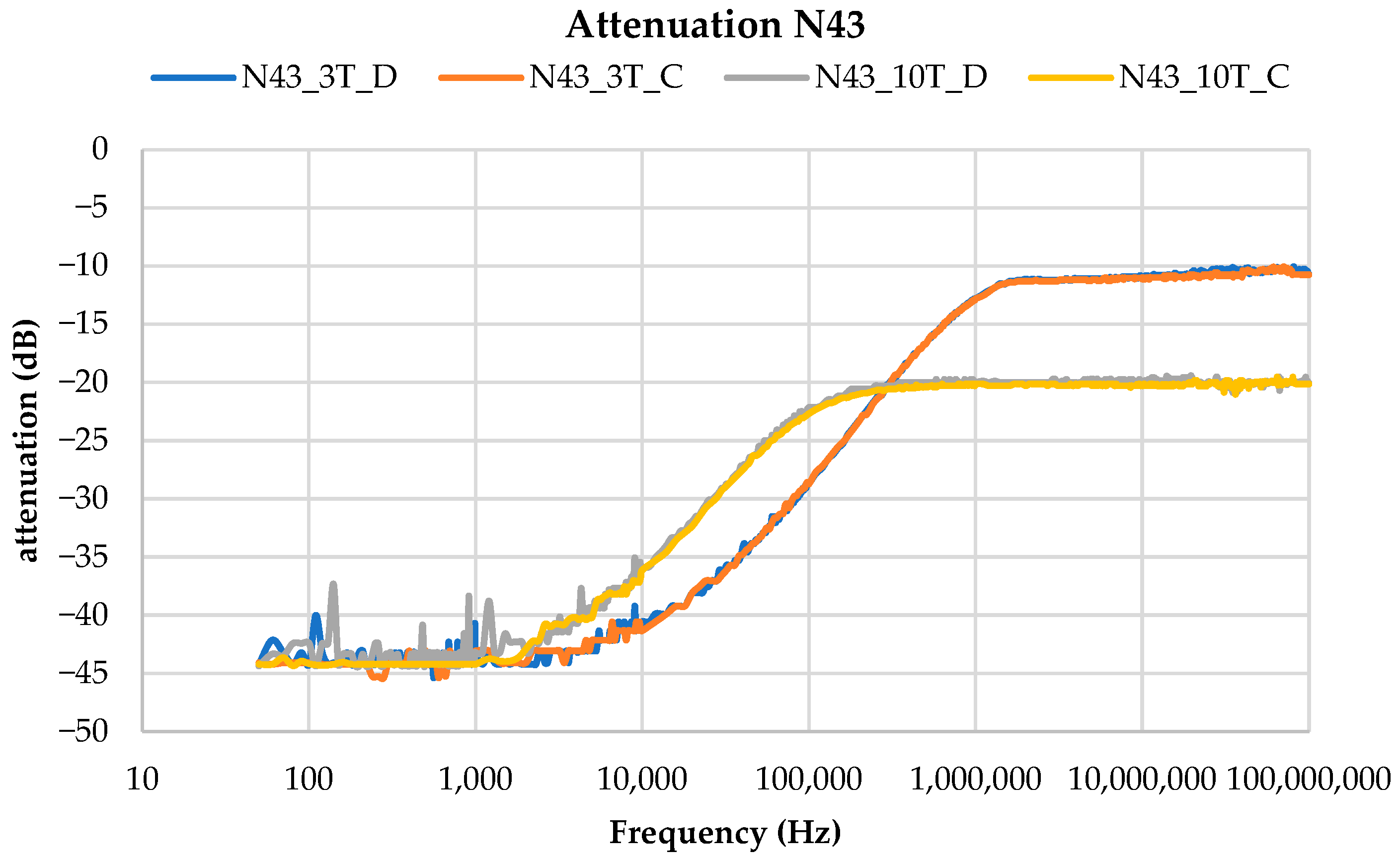 Furthermore, for the N43 core in both configurations, the high cut-off frequency exceeds 100 MHz.