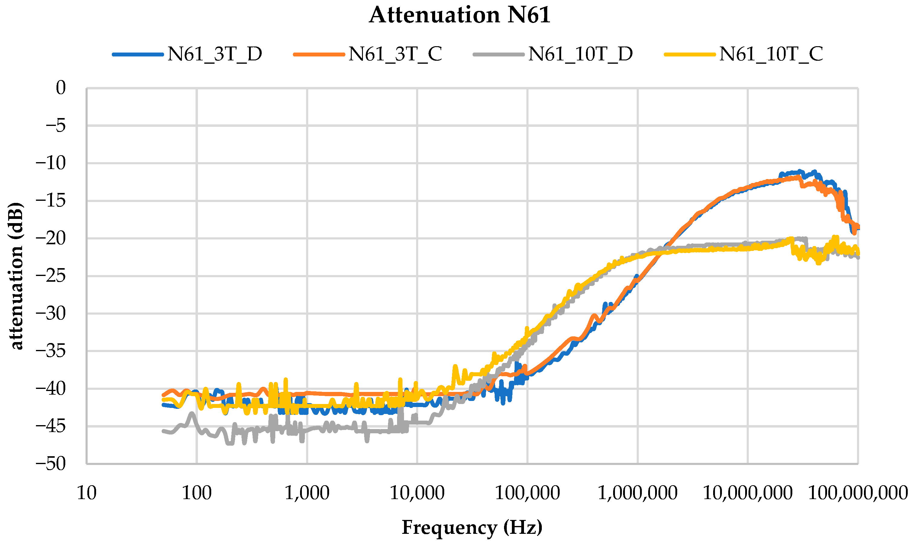 The N87 core, in the ten-turn configuration, shows a behavior similar to that of the N43, having a low cut-off frequency of −6 dB at 20 kHz. However, in the three-turn configuration, the N87 core exhibits a more limited high cut-off frequency compared to the N43, with −6 dB bandwidth from 200 kHz to 60 MHz. Finally, the N61 core, in the three-turn configuration, presents a significantly reduced bandwidth compared to both N43 and N87, showing −6 dB bandwidth from 2 MHz to 100 MHz. In the ten-turn configuration, it shows a relatively high low cut-off frequency of −6 dB at 300 kHz.