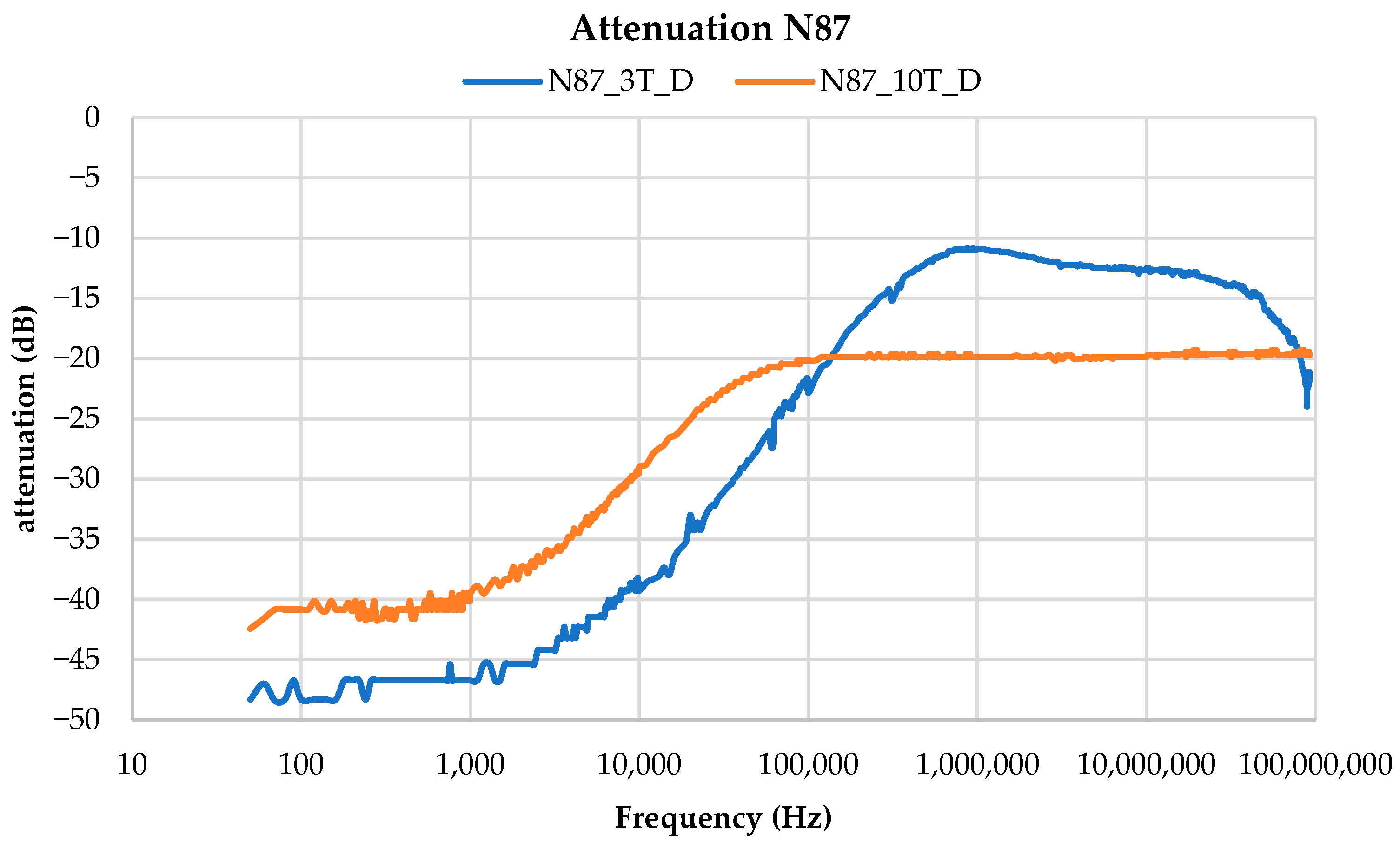 Both the N87 and N43 cores exhibit similar trends: the three-turn configurations show lower attenuation compared to the ten-turn solutions. Conversely, when the transfer impedance is considered, the configurations with fewer turns consistently provide higher impedance values.