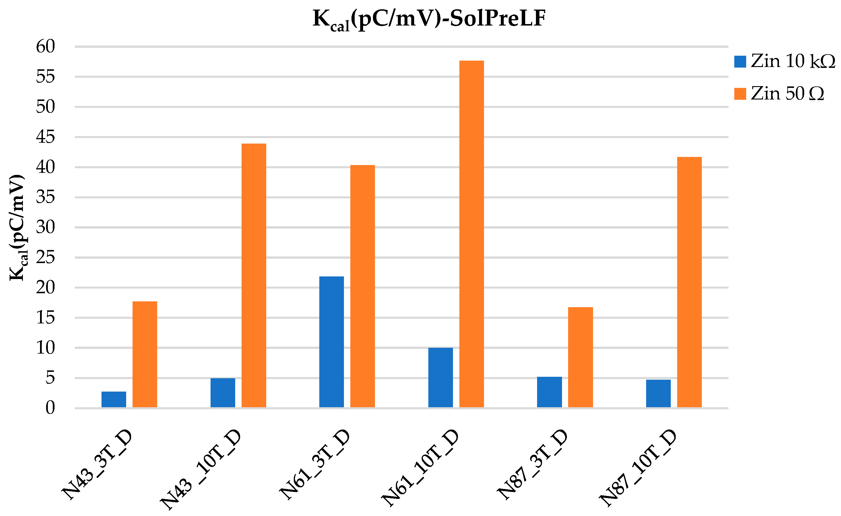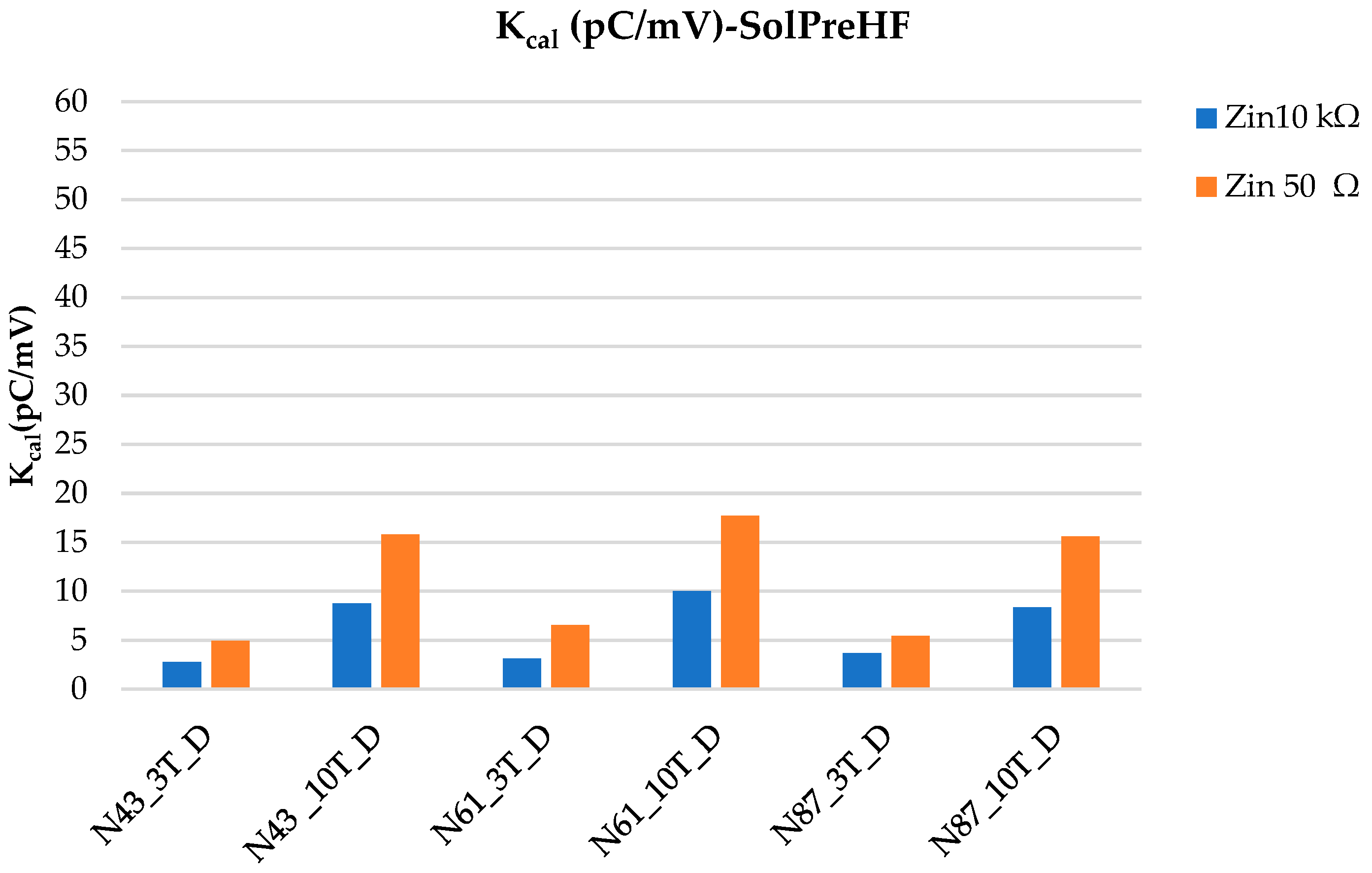 Consequently, the calibration constants obtained using SolPreLF are generally higher. Conversely, the SolPreHF amplifier is specifically designed for high-frequency PD measurements and provides a wider effective bandwidth from 3 MHz to 100 MHz. This frequency range is higher than the bandwidth specified in the IEC 60270 standard. Consequently, it is not possible to calibrate the PD measurement circuit according to the standard procedure. However, it is possible to determine the ratio between the injected charge and the peak value of the corresponding measured voltage. This ratio is referred to here as the calibration constant, , similarly to the case of low-frequency measurements, since the corresponding units are .