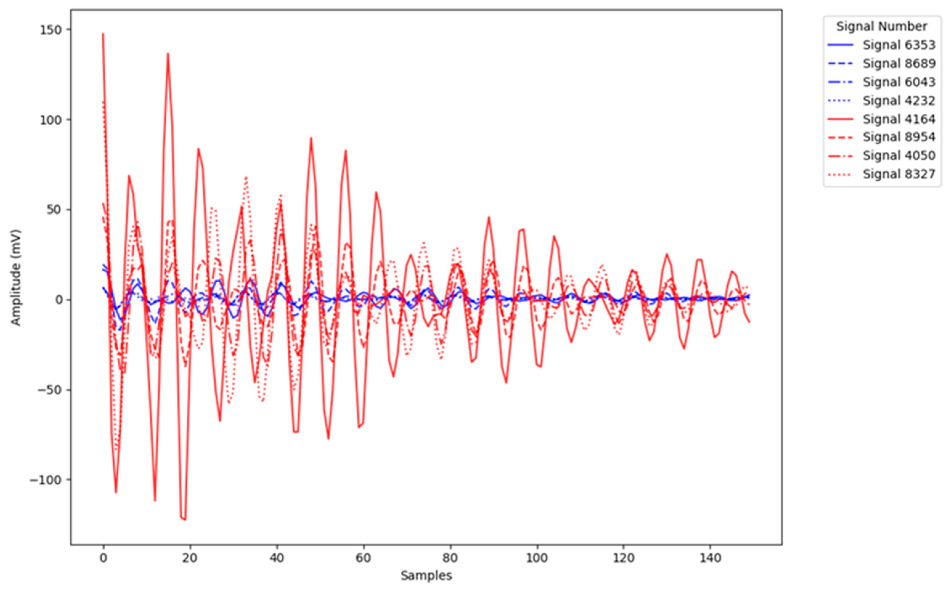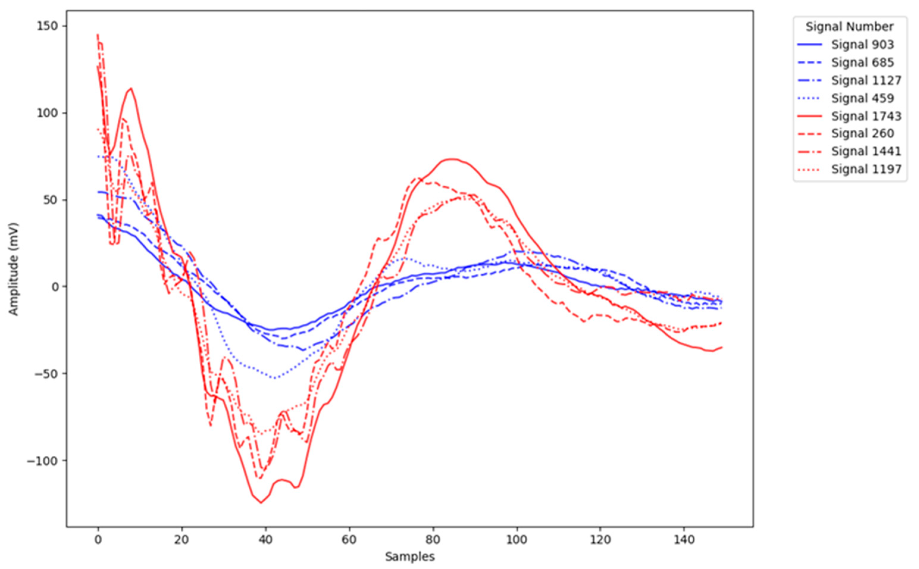 First, the impulse signals were temporally aligned to ensure waveform comparability. Each signal was shifted so that its absolute peak was positioned at the same reference sample. For positive impulses, alignment was performed at the maximum peak, while for negative impulses, it was performed at the minimum peak. In this way, all signals were synchronized at their absolute extremum.