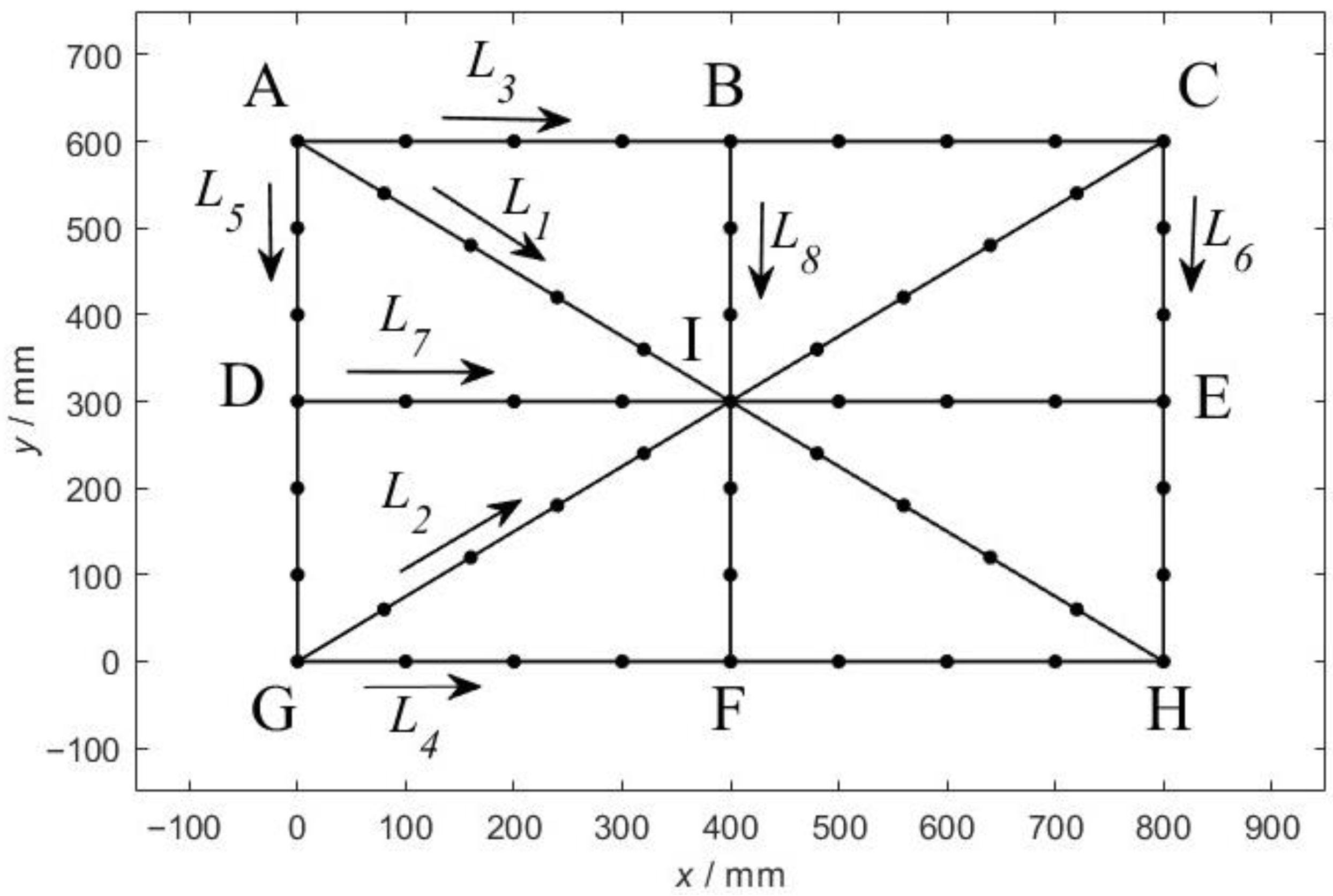 - The inner lines L7 (between B and E) and L8 (between D and F) are evaluated using Equation (1) giving all points on the line including additional values for I that are called the closure errors.