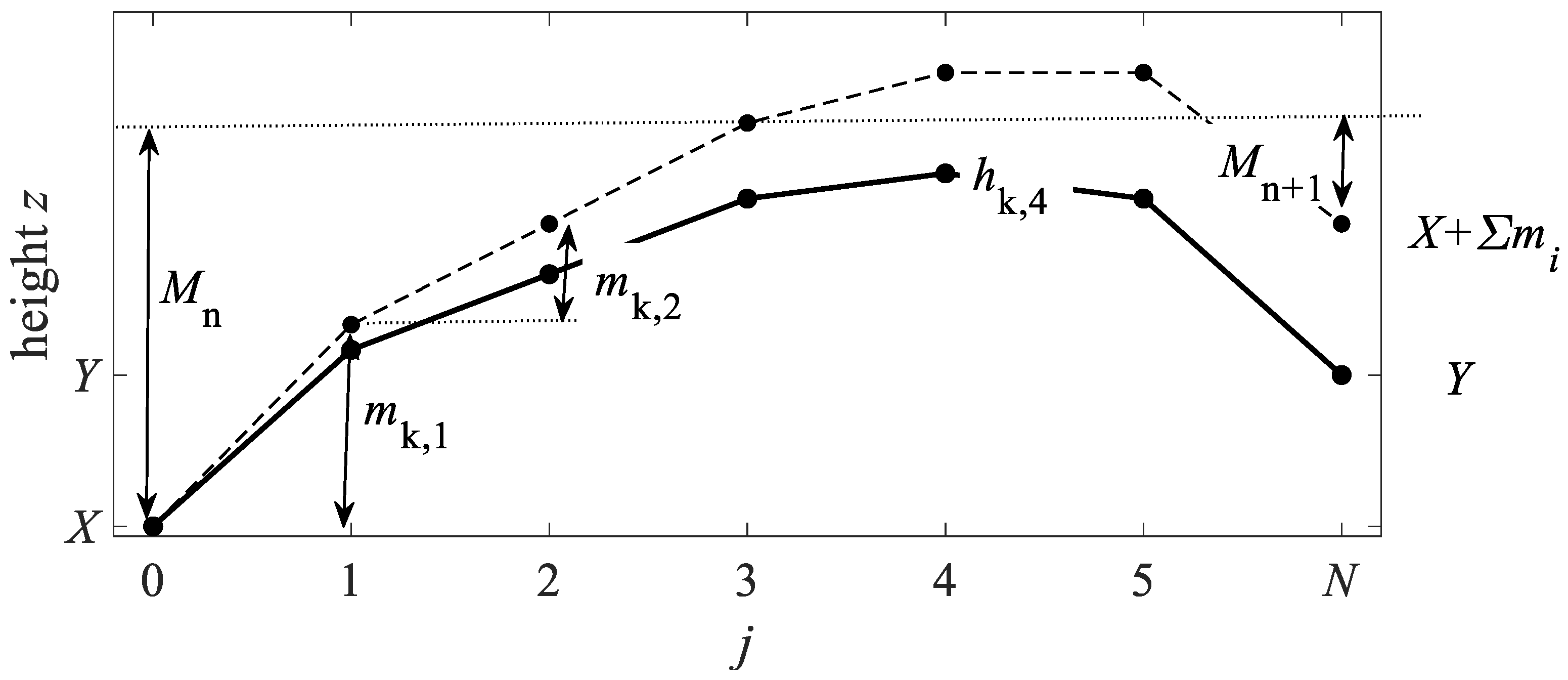 - The measurements are evaluated according to one of the methods given in Section 3.1, Section 3.2 and Section 3.3, giving the heights hi,j that are used as a reference in the simulations.