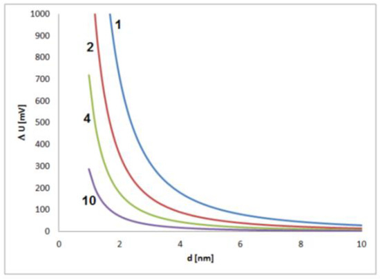 Estimated contribution of a single elementary charge on the potential of a single metal nanoparticle in dependence on the particle size for values of dielectric constant (electrical permittivity) of 1, 2, 4 and 10 and an assumed thickness of the electrochemical double layer of 0.5 nm.