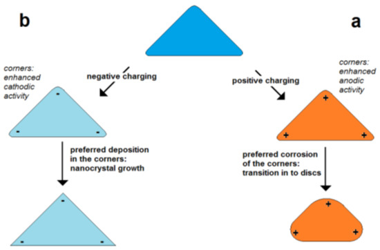 Self-polarization effect: effect of excess charge on the change of particle shape in dependence on charge sign shown for the example of a flat triangular metal nanoprism (schematically); (a) enhanced positive charge in the corners of triangular particle, (b) enhanced negative charge in the corners of particles.