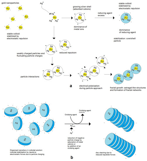 Assembly behavior of charged metal nanoparticles: (a) spherical nanoparticles; (b) nonspherical metal nanoparticles, for example nanodiscs.