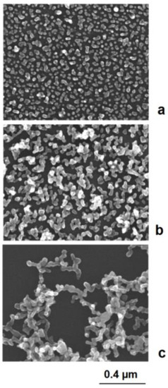 The interplay between lattice-directed metal deposition and accidental deposition can be nicely observed in the case of the formation of Au/Pt nanorods [38]. The seed-like gold nanorods are positively charged due to adsorbed cetyltrimethylammonium cations (CTAB). This charge and, therefore, the electrochemical potential of the nanoparticles, are lowered by the addition of the reducing agent, which can be oxidized on the particle surface. If a slight reduction of potential only occurs, the nucleation of platinum can only proceed on crystallographic exposed points on the gold surface. As a result, the structure of the deposited platinum nanocrystallites follows the borderlines between the crystallographic surface planes of gold nanorods. At low deposition rates, the nucleation of platinum starts on these borderlines between the crystallographic planes of the single-crystalline gold nanorods. The decoration of these crystallographic lines by the platinum crystallites is clearly visible in the SEM images (Figure 10a). At moderately enhanced platinum deposition activities (enhanced platinum precursor concentration), the nucleation of platinum also takes place on the crystallographic planes; the decoration effect of the borderlines between the planes, however, remains visible (Figure 10b). In this case, a more stochastic distribution of platinum crystallites in the shell is formed. At a higher precursor concentration, the nucleation probability generally increases, the dominance of the borderline-directed nucleation disappears, and a comparatively dense shell of platinum crystallites is formed around the gold core (Figure 10c).