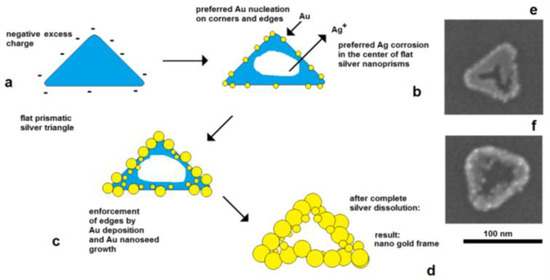 Electrically controlled formation of metal frame particles by the substitution of a less-noble metal by a noble metal. Deposition of gold on flat silver nanotriangles: (a) negatively charged silver nanotriangles in the colloidal state; (b) starting gold deposition on the particle edges (lowest potential) and starting silver corrosion in the center of the flat prism (highest potential); (c) enforcement of gold in the edge regions of particles; (d) formation of a gold frame by the complete dissolution of silver (schematically); (e) silver triangle with a hole formation in the particle center; (f) advanced silver dissolution and edge-directed gold deposition (SEM images).