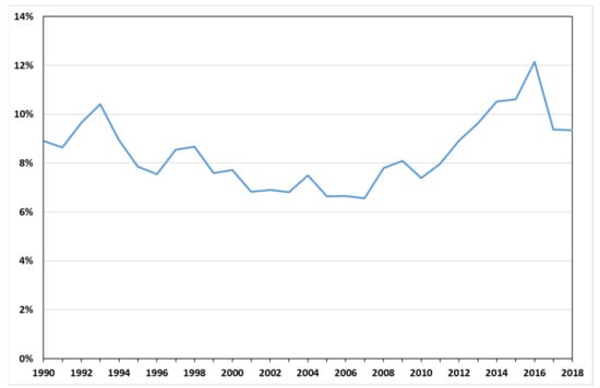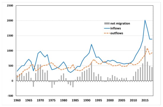 Net migration is reflected in the average migration balance, which stands at just over 200,000 foreigners throughout the entire period since 1960. The migration regimes are likely to have changed in the meantime, however [60]. One reason for this is from the German perspective the enlargement of the EU and the Schengen area, with the free movement of workers constituting a key factor. It has to be taken into account that migration has increased throughout the world, in particular for reasons such as flight and displacement [61], and there is talk of a new migration regime for Germany, too [50]. Indeed, in the period following reunification, i.e., from 1990 to 2018, the average migration balance of the non-German population was considerably higher than earlier values, at 264,000 foreign nationals. This average, however, was influenced by the collapse of the Soviet Union and the wars in Yugoslavia in the early 1990s as well as the conflicts in the Middle East and the Maghreb states in the past decade. Additionally, the economic and financial crisis of 2007/2008 and the eastern enlargement of the EU played a considerable role, in the latter case, especially the free movement of labor for Bulgaria and Romania since 2014 [4,5]. Migration was at lower levels between these periods.