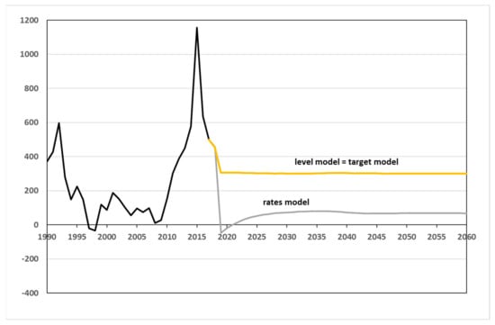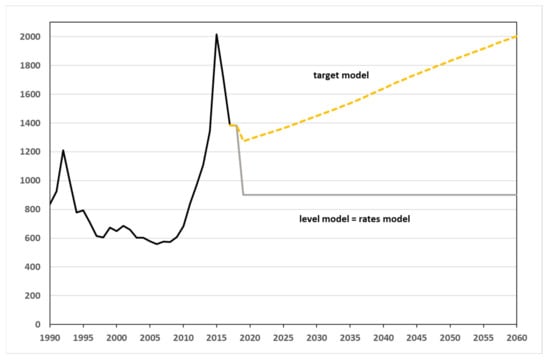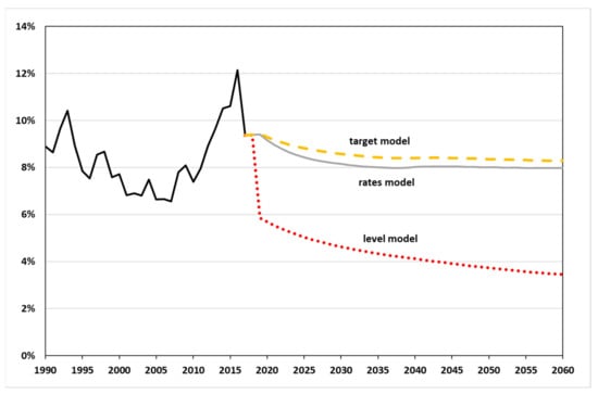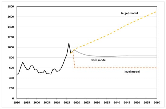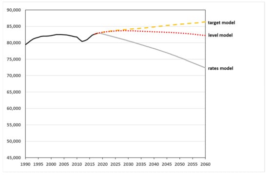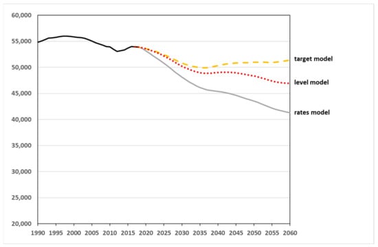 Figure 6 portrays the simulated migration balances. In contrast to the level and target models, in which the migration balance was set at 300,000 persons, the rates model estimates the migration balance endogenously. With the given modeling approach, net migration plunges dramatically in the first year of the simulation in the rates model and even becomes slightly negative. Although the migration balance subsequently increases in the rates model, it remains well below its previous values during the remaining simulation period from 2020 to 2060, at about 60,000 net inflows per year (i.e., the long-term average of about 264,000 persons per year from 1990 to 2018).