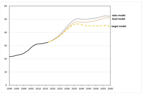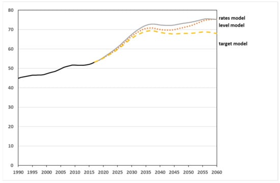 Development of the old-age dependency ratio (as %) until 2060—simulation results from 2019 onwards. (Sources: [64]; own computation and design.)