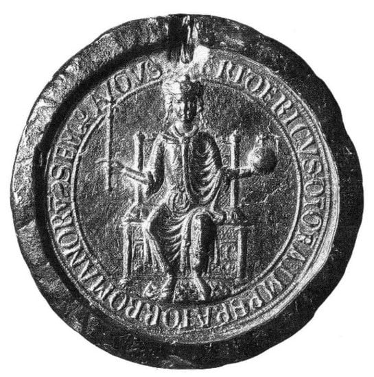 On 26 December 1208, when Frederick II began to rule independently, he continued to use bulls and seals prepared during the regency period as the King of Sicily. The first are hanging gold bulls with a diameter of 55 mm (on the bulls as the King of Sicily, see: [] (Volume 1, pp. 27–30, images no. 27,3–4), [] (p. 40), [] (p. 302)), and the second are hanging red wax seals with dimensions that varied between 35 × 45 and 40 × 53 mm that are placed in a wooden box with a diameter of 60 mm (on the seals as the King of Sicily, see: [] (Volume 1, pp. 27–30, images no. 27,1–2 and 27,5), [] (Volume 1, pp. 29–31, cards no. 43 and 45), [] (pp. 25–27), [] (pp. 118–120), [] (card II.4, pp. 325–326), [] (Volume 2, p. 26, card II.A.7 by V. Rödel)). Both of these types present the king sitting on the throne, even though the garments and symbols of power are completely different: the first group differs from the bulls of the Norman predecessors and is comparable to more continental European models; instead, the second group more or less follows the seals of the predecessors William II and Constance of Hauteville (about that, see: [] (p. 87)). However, both these bulls and seals were soon replaced by other types. Indeed, from December 1212, Frederick II began to use bulls and seals as the King of the Romans, and, from 22 November 1220, he used bulls and seals as the Holy Roman Emperor (used until his death on 13 December 1250). Both of the bulls are in gold and have diameters of approximately 62 and 42 mm, respectively; on one face, they present the king sitting on the throne, while, on the other face, they present an urban structure (presumably, a symbolic representation of Rome) or a sort of geographical map of Southern Italy (presumably, a symbolic representation of the Kingdom of Sicily) (on the bulls as the King of the Romans, see: [] (Volume 1, pp. 27–30, images no. 28,2–5), [] (Volume 1, pp. 31–34, cards no. 47 and 49), [] (card III.2, pp. 330–331). On the bulls as the Holy Roman Emperor, see: [] (Volume 1, pp. 27–30, images no. 30,2–5 and 30,6–7), [] (Volume 1, p. 35, card no. 51), [] (p. 302), [] (Volume 2, pp. 27–28, card II.A.9 by V. Rödel)). Both of the seals are in red wax and have diameters of approximately 85 and 90 mm, respectively; again, they present the king sitting on the throne (on the seal as the King of the Romans, see: [] (Volume 1, pp. 27–30, images no. 27,6–7 and 28,1), [] (Volume 1, pp. 31–33, cards no. 46 and 48), [] (pp. 28–29), [] (card II.5, pp. 326–327 and card III.1, p. 329), [] (Volume 2, p. 27, card II.A.8 by V. Rödel). On the seal as the Holy Roman Emperor, see: [] (Volume 1, pp. 27–30, images no. 29,1–5 and 30,1), [] (Volume 1, p. 34, card no. 50), [] (p. 30), [] (p. 128), [] (card III.15, pp. 346–347)).