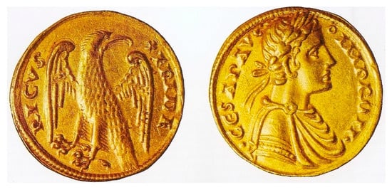 This coin is made with gold at 20.5 carats, weighs between 5.24 and 5.29 g (between 2.63 and 2.65 g in the mezzo augustale version), and has a diameter of 20 mm. It was directly commissioned by Frederick II and was minted in Messina and Brindisi from 1231 to 1250. On the reverse side, FRIDERICVS is inscribed and the image of an eagle, the symbol of the empire, is found. On the obverse side, IMP(ERATOR) ROM(ANORUM) CESAR AVG(VSTVS) is inscribed and the royal image is found. The king is in half bust, in profile position, and he has short hair and is clean shaven. Moreover, he wears a paludament and a laurel wreath as well as an ancient Roman emperor (Figure 3). Iconographic affinities have been highlighted with the coins of the Carolingian Emperors Charlemagne and Louis the Pious but also of the Roman Emperors Constantine and, above all, Augustus. Certainly, symbols of power, attires, and physical features perfectly imitate that of an ancient Roman emperor (about the augustale, see: [] (Volume 18, p. 196), [], [] (pp. 209–210 and pp. 705–711), [], [] (p. 195), [] (pp. 73–74), [] (pp. 70–74), [] (p. 272), [], [] (pp. 634–636), [], [] (Volume 2, pp. 54–56, cards III.A.2–6)).