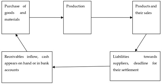 The above-mentioned steps comprise the working-capital cycle. Its definition is as follows: it is the period that elapses from the moment of spending funds for the purchase of factors of production until obtaining cash revenues for sold products, which are produced thanks to these factors [6,10]. The length of this cycle consists of the inventory-, the receivables-, and liabilities-conversion cycles.