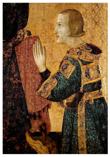 In the second group, instead, are representations connected with religious and devotional contexts and associated, so to speak, with the private sphere and the personal practices of Robert. They represent the Angevin as a devotee (face in profile, kneeling position, small size, and proximity to religious subjects) while he carries out liturgical activities and devotional acts. What is more, they render, following the report on the bones of the King by the Istituto di Anatomia Umana Normale dell’Università di Napoli in June 1959 (see [11] (pp. 40–42)), his real physical features: light brown hair that falls straight down to the neck and concludes with a rather tight curl; shaved, thin, and oblong face; protruding and pointed chin; accentuated jaw; thin lips; pronounced nose; narrow eyes that, as well as the cheeks, are rather sunken and that highlight the cheekbones; high and spacious forehead; and deep wrinkles around the nose and mouth (Figure 1). This entry focuses on this second group of images. In particular, they are the following four artworks: Simone Martini’s altarpiece, the Master of Giovanni Barrile’s panel, the Master of the Franciscan tempera’s canvas, and the so-called Lello da Orvieto’s fresco (regarding the identification of Robert of Anjou’s official image, see [12] (pp. 97–110), with more information and bibliographic references).