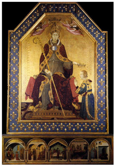 This altarpiece, painted on wood and now in the Museo di Capodimonte in Naples, represents Saint Louis of Toulouse crowning his younger brother, King Robert of Anjou (Figure 2) (regarding this image, see: [13,14,15,16,17], [18] (pp. 136–154), [19,20,21,22,23,24], [25] (pp. 133–147)). The Sienese painter Simone Martini (who directly signed the artwork with the inscription «SIMON DE SENIS ME PINXIT») painted this altarpiece indicatively between the summer of 1317 and 1319 (namely, in the years immediately following the canonisation of the Saint). The panel has a main body of 250 × 188 cm and a predella of 56 × 205 cm, but Julian Gardner has hypothesised that, originally, it also had lateral small columns and, at the top, a pinnacle with the image of a blessing Christ [13]. The main scene is enclosed in a blue band decorated with lily flowers and, at the top, a five-pointed red label (allusion to the heraldic symbol of Robert himself). Moreover, it has a golden background edged with a weave of lilies. The panel represents Saint Louis of Toulouse seated on a throne while two angels are crowning him and, in turn, he is crowning his younger brother. Robert is devoutly kneeling at his feet and he wears ceremonial robes and a sort of pallium, both richly decorated and embroidered with the coats of arms of Anjou and Jerusalem. If the face of Louis, in the frontal position, is rather stereotyped, the face of Robert, in profile position, is considered one of the first examples of a portrait in medieval art and, as said, it follows the real appearance of the King. Precious gems and goldsmith works directly embedded in the wooden panel decorate the whole composition. In the underlying predella, there are five episodes of Louis’ life taken from the texts of his canonisation process. From left to right, they are as follows: the election as bishop by Pope Boniface VIII; the taking of the Franciscan habit and the consequent acceptance of the bishopric of Toulouse; Louis in the act of serving at the table; Louis’ death; and his post-mortem miracle (regarding the scenes in the predella, see [19]).