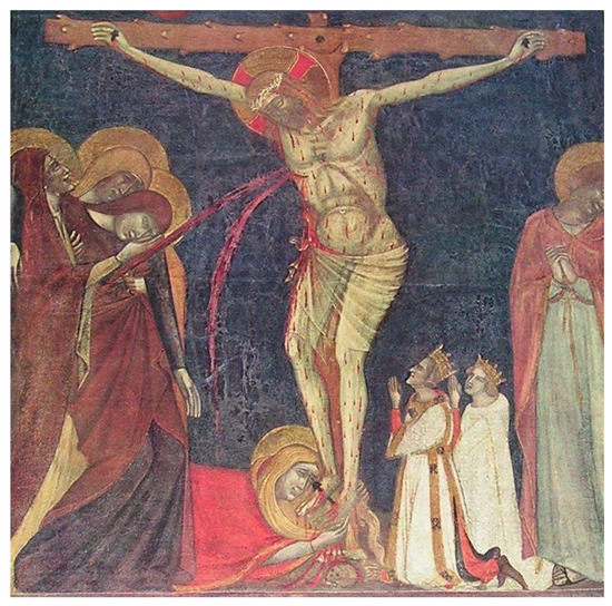 This tempera on canvas, now in a private collection, represents—in a rather pathetic and intense way—a crucifixion (Figure 4) (regarding this image, see: [32] (pp. 235–237 and p. 257), [38] (pp. 88–89 and pp. 409–413), [39] (p. 48), [40], [35] (p. 149 and p. 166, note 81), [41] (p. 73, p. 78, and p. 80)). It has been attributed to a southern artist active in Naples conventionally defined as Master of the Franciscan tempera, and it has been hypothetically dated to the 1330s, but no later than 1336. This work has rather large dimensions (130 × 135 cm, and note that it has been cropped in the margins) and it was part of a wider series of which only three other canvases remain: Madonna with Child between Saint Mary Magdalene and Saint Clare of Assisi, Stigmata of Saint Francis of Assisi, and Flagellation. The scene represents, on a dark blue background, Christ nailed to the cross with Saint John the Evangelist, Saint Mary Magdalene, and the Virgin, presumably sustained by Mary (mother of James the Less and Joseph) and Salome (the references are to Mt 27,55–56 and Mc 15,40–41), around him. Kneeling at the foot of the cross are Robert of Anjou and Sancia of Majorca. They are much smaller than the other figures and are depicted in profile position and in an act of prayer. Robert is wearing a red tunic and a white ceremonial robe quilted ton sur ton with small lily flowers. He is bearing the usual lily crown and golden pallium embroidered with medallions decorated with lily flowers. The King’s face has the aforementioned physiognomic features.