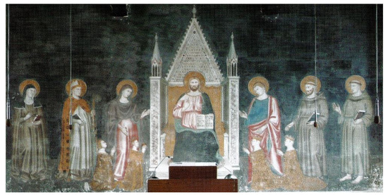 Regarding the commission of this artwork, it is plausible that the same Angevin royals ordered it (in particular, Robert or Sancia, who were most involved with the foundation of the Monastery of Santa Chiara). Regarding visibility, it is worth noting that the chapter house was the hall where, generally, the friars of the monastery gathered themselves in assemblies in order to enact provisions and deal with affairs concerning the life of the monastic community. Moreover, this place hosted the celebration of the provincial and general chapters of the Order and it was used as representative space at the time of receiving distinguished guests. Therefore, some persons who were not strictly part of the aforementioned community occasionally experienced admission to this hall, but we should consider that, almost exclusively, only members of the Franciscan Order accessed it and, in particular, only the friars of the Monastery of Santa Chiara regularly attended this hall. Hence, the visibility of the fresco, despite its monumental dimensions, was rather limited and restricted to a reduced group of religious persons. For this reason, we can hypothesise that the painting did not play a political or propagandistic role, but instead had a more religious and liturgical function. In particular, the fresco likely did not aim to celebrate the Angevin royals and it did not stage the divine consent to their authority, but instead displayed to the friars of Santa Chiara the devotion and religiosity of the Angevin rulers and it reminded them of one of the main tasks that, as well as the Poor Clares, they had in the monastery: to pray to Christ in favour of the members of the Angevin dynasty in order to obtain (thanks also to the intercession of the saints depicted in the fresco) forgiveness for their sins and the achievement of eternal salvation for their souls (for more details and bibliographic references about this interpretation, see again [12] (pp. 145–152)).