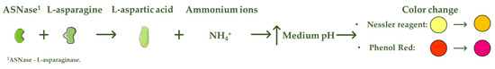 ASNase-based biosensors are a promising and innovative technology that can be used both to detect and monitor the level of L-asparagine in blood serum samples of leukemic patients and in different food samples [6]. The methods currently used to detect L-asparagine are based on spectroscopy and chromatography techniques [20], whereas the biosensor operation mode is mostly based on colorimetric detection. The L-asparagine hydrolysis releases ammonium ions, promoting, consequently, a change in the pH value of the medium followed by a variation in the color [21], being the mode of action of colorimetric ASNase-based biosensors (Figure 1). Although there are few reports on the development of ASNase-based biosensors, biosensing systems prove to be imperative for pharmaceutical/food industrial applications due to their simplicity and fast response, while allowing online L-asparagine monitoring.