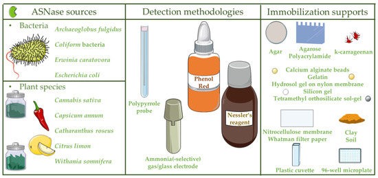 ASNase-based biosensors: ASNase sources, detection methodologies and immobilization supports.