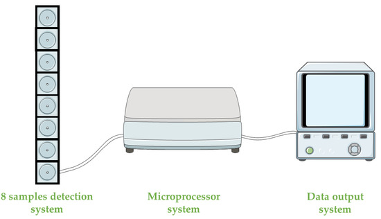 Even though ASNase is broadly distributed in nature (plants, animals, tissues and microorganisms (bacteria, filamentous fungi and yeast)), the majority of commercialized ASNase are from recombinant microorganisms, i.e., Escherichia coli and Erwinia chrysanthemi [6,33,34]. Thus, a simple, safe and real time method suitable for biological applications, based on E. coli ASNase, was produced for ammonia detection by the connection of a conducting polymer, polypyrrole (PPY) probe, previously chemically deposited on the polyimide surface to a piezoelectric quartz crystal (PQC) in multi-channel series (MS) (PPY-MSPQC system) [24]. This method comprises three main elements: an eight-sample detection system, a microprocessor system (responsible for the signal transference from the frequency counter to a computer) and the data output system (Figure 3). In fact, the PPY-MSPQC system enabled an ASNase activity assay with the same accuracy as Nessler’s reagent method due to its excellent ammonia sensing features [24].