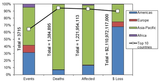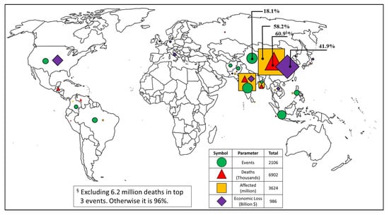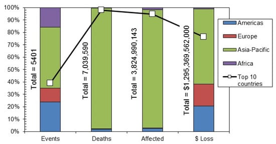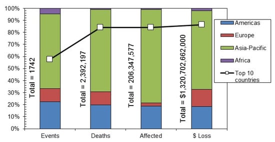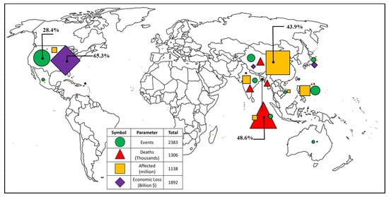 This section examines the distribution and impact disasters caused by three types of natural hazards, i.e., geophysical, hydrological, and climatological, which happened around the world since 1900. The reason for focusing on this type of disasters is given in Section 2. Data used to compile the presented information were obtained from the Emergency Events Database (EM-DAT) maintained by the Centre for Research on the Epidemiology of Disasters (CRED) at the Catholic University of Louvain, Belgium []. For a disaster event to be listed in this database, at least one of the following criteria is to be met: