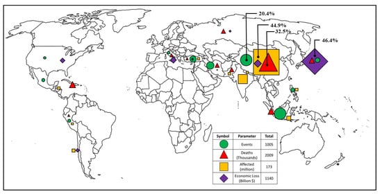 It is also noteworthy in Figure 2 that almost half of these events occurred in the top 10 countries, while the burden of human and economic loss shared by the top 10 countries is more than 80% of the overall total. This finding is in line with the earlier observation that, since the year 1900 AD, only about 100 major earthquakes have resulted in more than 93% of the total fatalities [] and more than 95% of the total economic loss [].