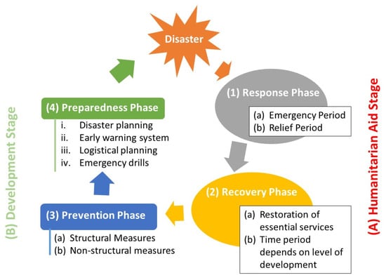 Disaster management comprises actions taken before and after the occurrence of a natural disaster to manage the negative consequences of the event. Disaster management is a cyclic process and comprises two stages and four phases, as depicted in Figure 8. Two phases (i.e., prevention and preparedness) precede a disaster event and are categorized as the development stage activities. The other two phases, i.e., response and relief, that immediately follow a disaster event constitute the humanitarian aid stage activities. This comprehensive model of disaster management developed in the USA is termed as PPRR []. Risk-driven and vulnerability-focused disaster management paradigms have also been proposed as competing models to PPRR [,,]. However, the PPRR model is still widely used, and disaster management concepts in this article will be explained based on PPRR.