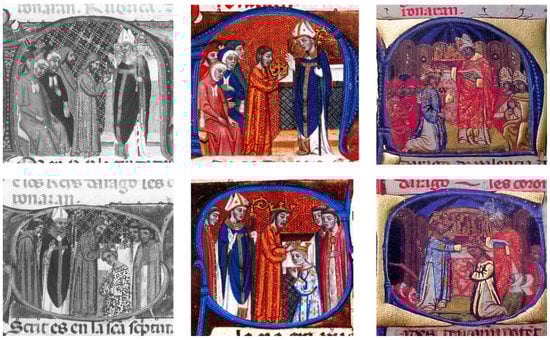 In 1353 he ordered a coronation ceremonial to be drawn up so that those who “reign after us would know and, having it written down, could not neglect or not know” [] how the liturgy was to be performed. He regulated and consolidated each phase of the rite to reinforce the potency of the self-coronation gesture (which displayed his power in the sight of his subjects) and to confirm his idea of separation between the two parts of the ceremony: the spiritual, with the anointing of the archbishop; and the temporal, the coronation, in which the king alone took the insignia directly from the altar. Thus, by eliminating everything that hindered the image of its sovereignty, the monarchy’s autocratic character became evident and can be seen in the miniatures of two of the three surviving illuminated codices: the twin copies in the Lázaro Galdiano Foundation and the National Library of France (Ms Reg 14425 and Ms Esp 99, respectively) [,] (Figure 1). In them, the sovereign, wearing a paly dalmatic, facing the altar and in front of individuals seated on wooden benches, holds a large fleur-de-lis crown in front of the metropolitan of Saragossa, whose role is limited to imparting the blessing. Visually, Peter IV shows the elimination of all ecclesiastical involvement in the presentation of the crown which, in the eyes of the people, symbolised the handing over of the kingdom. The same was true of the coronation of the queen who, kneeling and praying, in the three copies receives the crown from the king’s hands []. The copy from the Fundación March shows the sovereign kneeling, receiving the crown from the metropolitan and in the presence of several prelates [].