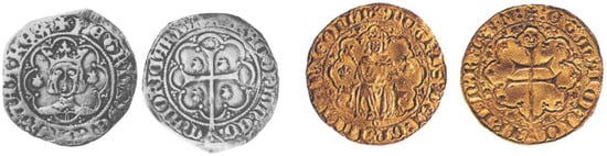 Ral and Ral d’or of Peter IV. Mallorca. Published by Crusafont, Numimsmàtica de la Corona Catalano-Aragonesa medieval (785–1516); Vico: Madrid, Spain, 1982; num. 252 and Guia art gòtic, Museu Nacional d’Art de Catalunya: Barcelona, Spain, 1998, p. 54, fig. 1.1.