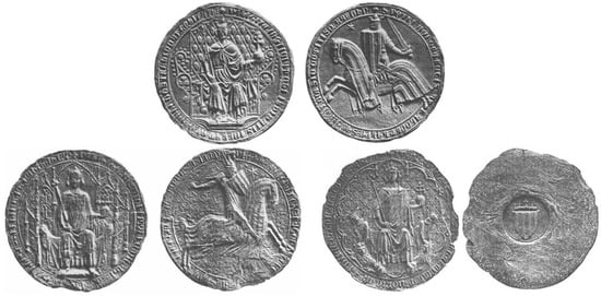 - Dalas, M. Les sceaux royaux et princiers. Étude iconographique. In Chartes, Sceaux et Chancelleries. Études de Diplomatique et de Sigillographie Médiévales; Bautier, R.H., Ed.; Droz: Paris, France, 1990; Volume II, pp. 76–95. [Google Scholar]
