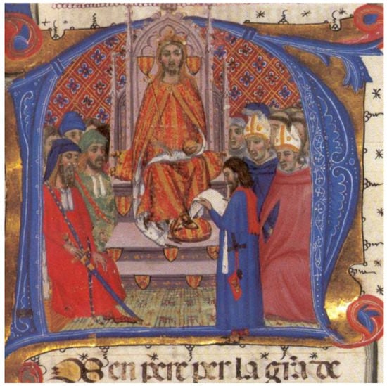 In his miniatures, the king, elegantly attired, attends to each official whose ordinances he heads. The first folio is extraordinary (Figure 4). The border contains plant and animal motifs and the coat of arms of Aragon (the paly), the cross of Saint George (whom Peter emphasised for his role as defender of the monarchy and of whom he obtained relics) and the cross of Iñigo Arista (which he defined as the “ancient sign of the king of Aragon”) []. Within the initial, Peter IV sits on a magnificent Gothic throne raised by steps and decorated with coats of arms bearing the pales of Aragon, a pattern that is repeated in the solemn vestments and cushions, including the one beneath his feet. It is a visual representation of what is laid down in the ordinances, both in terms of how the king should dress, his regalia and accessories, and in terms of how the attendants should position themselves in relation to him and address him (See [], among other chaps. 81. De les vestedures e altres ornaments; and 89. De la manera de seer e proposar en consell nostre; Study of its illuminations in [], pp. 276–283).