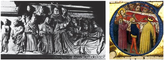 The tomb of the saint follows Italian models by Lupo di Francesco []. The cover, by another artist, displays sculpted motifs that were contemporary to the time of its execution, which itself was exceptional in the sculpture carried out in the Crown of Aragon at that time. During the solemn translation of 1339, among the retinue following the religious dignitaries (the Cardinal of Rhodes, the Archbishop of Tarragona and some of the “bishops and prelates of our kingdoms” (See [], Chapter 2, pp. 34–35), three individuals stand out in the foreground: the one in the centre is Peter IV, who takes off one of his gloves to touch the saint with his right hand before she is placed in the final tomb. To his right is the Infante don Jaime, brother of the king and then Count of Urgell []. It is unanimously agreed that the king of Mallorca is absent, although he could be the personage also wearing a diadem in the background, just behind Peter IV (See [], p. 437). Finally, preceding the king, wearing a nun’s habit and with a troubled gesture, is Queen Elisenda, by then already living in seclusion at Santa Maria de Pedralbes.