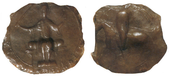 The seal’s peculiarity with respect to those of the rest of the Peninsula is that its two faces offer different iconographies. It was a type already used by foreign kings, who had devised it to reflect their possession of more than one title, a reality personified by Alphonse II, king and count at the same time. William the Conqueror had used such a strategy in 1069 in order to demonstrate his own double title: on one side he was shown equestrian as Duke of Normandy and vassal of the King of France, and on the other he was shown on the throne as King of England [13]. Although Alphonse II may have benefitted from another almost contemporary and closer model with the same iconography, namely that of Louis VII the Younger (little used: see Dalas, M. Les sceaux royaux et princiers. Étude iconographique. In [13], pp. 49–337, n. 67, p. 147), the iconographic concomitances between the English and the Aragonese models suggest the influence of the former, which would be reinforced by the links between the Plantagenets and the Aragonese in the territories of southern France [14].