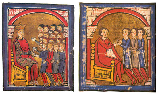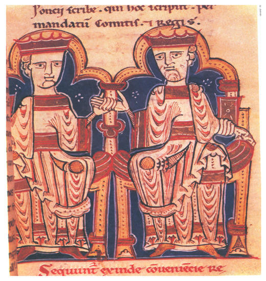 Liber Feudorum Maior. Canc. Reg. 1, Barcelona, Arxiu de la Corona d’Aragó ©. Fol. 19r. Alphonse II and Alphonse VIII of Castilla. End of the XII Century. Published by Magkanas et alii, Estudio de las miniaturas y del texto del Liber Feudorum Maior. Universitat de Barcelona: Barcelona, Spain, 2018, Fig. 2>.