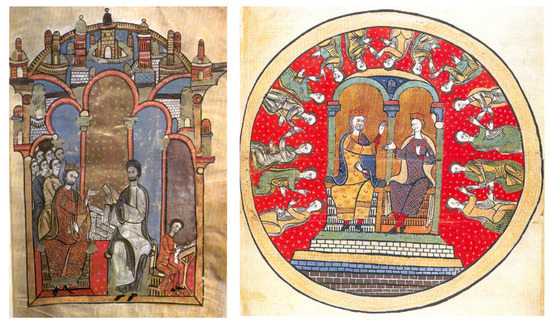 An early drawing (Figure 3) depicts Alphonse‘s confirmation of privileges in April 1174, whereby he agreed to ratify those granted by his predecessors to the cathedrals of Huesca and Jaca, and to donate to Bishop Esteban and the diocese of Huesca the tithe of the coinage and the royal revenues (Archivo Diocesano, Huesca, 2–16) [15]. It is the first and only portrait of a king of Aragon in Romanesque miniature, and it is intended to represent the sovereign and thus validate the document it illustrates, which explains why he points to the text with his right hand [16]. Although novel in the Crown of Aragon, it is not the first occurrence in the Iberian Peninsula, as is illustrated, for example, by one of the folios of the Libro de los Testamentos, preserved in Cabildo de la Catedral Metropolitana, Oviedo, also known as Liber Testamentorum (Details on the origin of this iconography in [11], pp. 110–111).