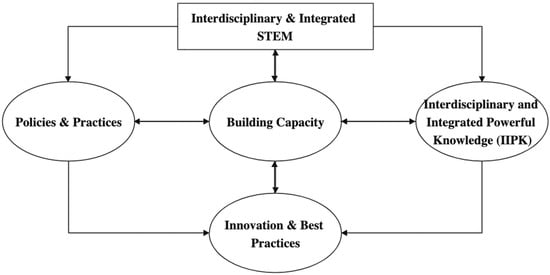 Post-COVID-19 demands changes in practices, including teaching, learning, and assessments, as virtual online platforms are taking over from face-to-face learning. This has happened suddenly and created a need, scope, opportunity, and commitment from everyone and everywhere across the world. Teachers’ beliefs, knowledgebase, and pedagogical practices would be the key to success in challenges faced in integrating online STEM education, and it is necessary for students to use inquiry approaches. The complexities associated with preparing confident, competent, and skilled teachers to achieve an ideal interdisciplinary and integrated STEM focus requires innovation in policies and curricular changes [23]. The process of building teachers’ capacity should be across primary, secondary, and tertiary education, and this will not happen in a vacuum, rather, it needs a collaborative effort. There is a need for willing and cooperative efforts for integrated interdisciplinary STEM practices by all stakeholders, and it is better to begin from building teachers’ capacity for using innovative classroom practices [24].