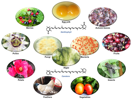 Nowadays, 722 organisms have been described as the source of the 1204 natural carotenoids currently defined in the Carotenoid DataBase (http://carotenoiddb.jp (accessed on updated: September 2020)) [6,7]. They are naturally produced by photosynthetic species (plants, algae, and cyanobacteria), some groups of fungi and some non-photosynthetic bacteria [4,8,9]. Although it is generally recognized that humans and animals are not able to produce their own carotenoids, the genome sequencing of the pea aphid (Acyrthosiphon pisum) detected carotenoid biosynthetic genes due to horizontal gene transfer from fungi [10,11].