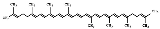 Lycopene (ψ, ψ-Carotene) is an open-polyene chain which lacks the β-ionone ring structures found in β-carotene (Figure 3). It is a red carotenoid synthesized naturally by some plants and microorganisms mostly in the isomer all-trans. The best known dietary intake of lycopene in humans is from tomatoes, but it can also be found at equivalent levels in other fruits such as persimmon, pink guava, or watermelon [55].