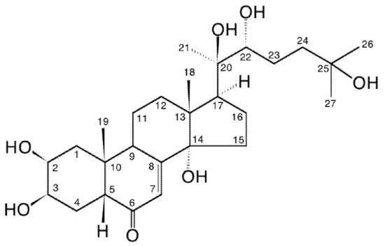 20-hydroxyecdysone (20E; β-ecdysone; crustecdysone; ecdysterone; polypodine A; isoinokosterone; CAS 5289-74-7; IUPAC 2β,3β,14α,20R,22R,25-hexahydroxy-5β-cholest-7-en-6-one).
