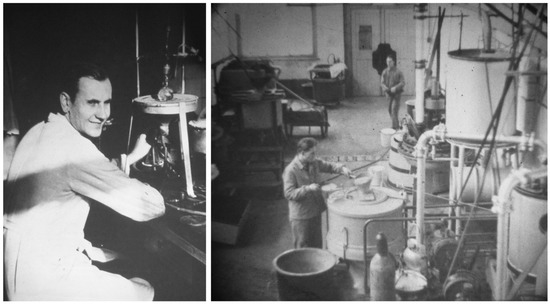 Prof. Peter Karlson and his laboratory in Marburg (Germany) where 500, then 1000 kg of silkworm pupae were processed to isolate pure ecdysone (Photographs courtesy of Prof. Jan Koolman, University of Marburg).
