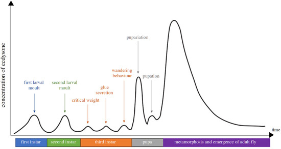 The developmental stages and ecdysteroid titres in Drosophila melanogaster. The X-axis is a timeline of the developmental stage, while the Y-axis represents the levels of ecdysteroid titre. Each of the ecdysteroid pulses triggers, respectively, embryogenesis, moulting, pupariation and metamorphosis. The ecdysteroid titre is expressed as 20E equivalents in whole-body homogenates (from Kannangara et al. [7]).