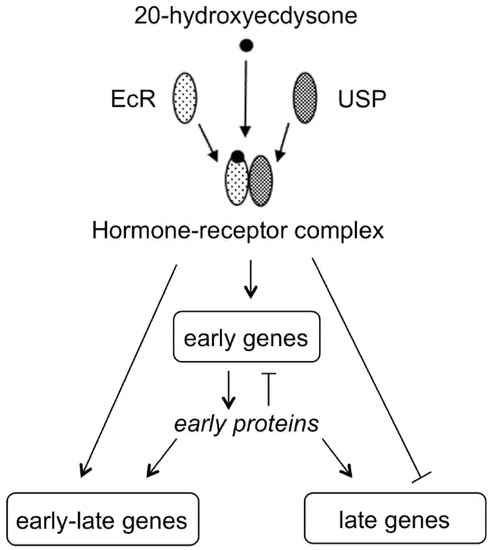 20E binds to a nuclear receptor (EcR) that forms a heterodimer with USP protein to activate the transcription of early genes that encode for transcription factors. This initiates a sequence of gene activations leading to the transcription of late genes that requires the withdrawal of the hormone (modified from Thummel [17]).