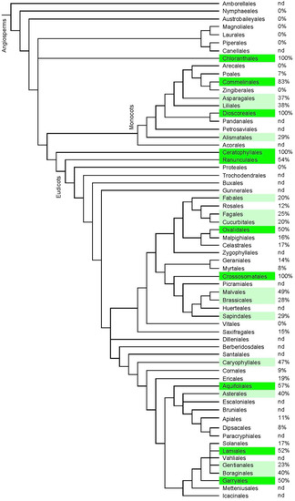 Indication of the frequency of ecdysteroid-containing species within the orders of angiosperm plants. The classification is according to APGIV (2016) [34], and the data concerning the presence or absence of phytoecdysteroids was taken from the “Compilation of the literature reports for the screening of vascular plants, algae, fungi and non-arthropod invertebrates for the presence of ecdysteroids” (Version 11; www.ecdybase.com), which provides data on 2282 angiosperm species. The data is qualitative (i.e., present or absent) and does not necessarily reflect the occurrence of high accumulators. The % frequencies of ecdysteroid-containing species amongst the assessed species in each order are indicated in the right-hand column; nd = no data available. Green colour: 50–100%; light green: 20–49% of investigated species.