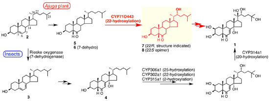 Summaries of the biosynthetic pathways for 20-hydroxyecdysone (1) from cholesterol (2) in insects (lower route) and Ajuga reptans var. atropurpurea hairy roots (upper route), highlighting the earlier involvement of a 22-hydroxylated intermediate (7) in the biosynthesis in Ajuga. Figure reproduced from Tsukagoshi et al. [36] (with permission).
